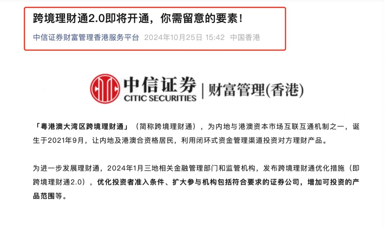 在昔日的几个月内,中信证券投教基地、中信证券钞票惩办香港干事平台、中信证券华南投教基地均陆续发布了关连跨境原意通的最新情况以及业务办理的历程。其中,10月25日,中信证券钞票惩办香港干事平台还以科普著作袒露:跨境原意通2.0行将通达,教导投资者属意因素。