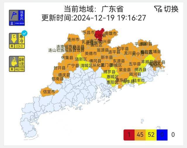 12月19日,受弱冷空气补充影响,全省各地最高气温较18日大批下跌3℃-4℃。其中,19日11时15分,韶关仁化县运转了广东本年下半年来首个冰寒红色预警。