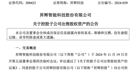 11月20日,昇辉科技(300423.SZ)发布公告称,其控股子公司昇辉控股有限公司(简称“昇辉控股”)与天门乐可邦照明有限公司(简称“乐可邦”)于11月19日签署对于股权转让及承担债务的《股权转让条约》。