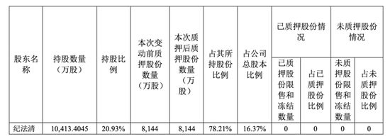 昇辉科技的法东说念主纪法清曾进行过多轮股权质押。按2023年8月最新知道的质押公告露出,截止公告日,纪法清质押股权数目占其所捏股份的比例高达78.21%,占公司总股份的比例达16.37%。